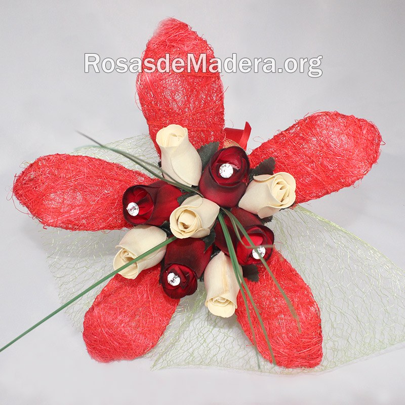 - Formado por 5 rosas de madera pequeñas y 4 rosas grandes con espiga decorativa
